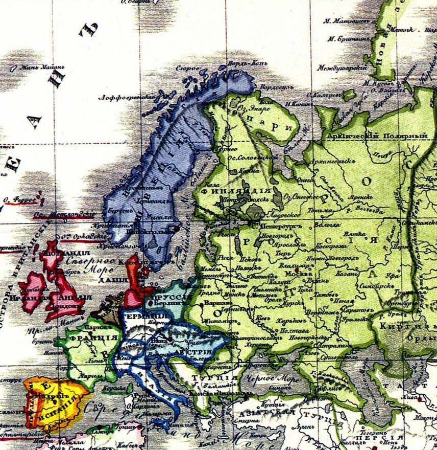 Прикольная карта. Что характерно, европейская Турция помечена там как уже часть российской территории (кто бы сомневался?). Азиатская Турция при этом "как бы в проекте"  Пиндостана на карте вообще даже не видно, он чуть меньше Мексики и чуть больше Швеции. Никакой "украины" и "польши" уже в помине нет. Видимо, карта относится к периоду между войной 1812 года и Крымской войной, в которой заговорщики сделали всё возможное, чтобы "опустить" Россию, а тогдашние российские правители потеряли нити управления, иначе эта война кончилась бы тем, что русские казаки очередной раз въехали бы в Париж, на этот раз уже навсегда. Чтобы не сомневаться в этом, достаточно посмотреть на карте на жалкие островки европейских государств и нависшего над ними зеленого монстра в полмира величиной. В общем, обидно за Россию, очень обидно