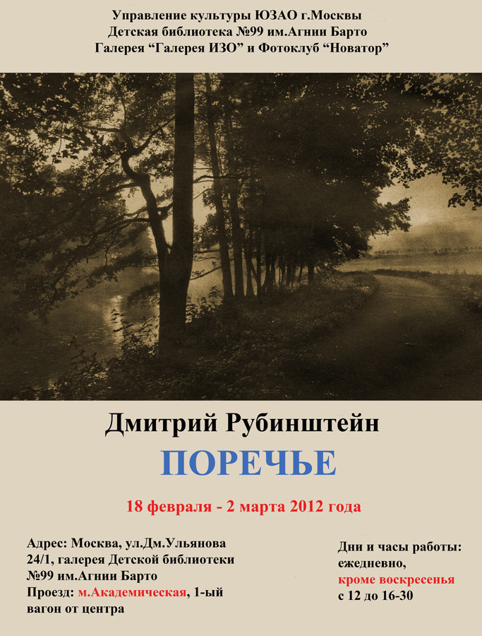 Обновленная галерея Детской библиотеки №99 им.А.Барто открывает фотосезон выставкой Дмитрия Рубинштейна "Поречье". Открытие выставки в субботу, 18 февраля с 13-30 до 16-00 в галерее Детской библиотеки №99 по адресу: ул.Дм.Ульянова 24/1 (проезд: м.Академическая, первый вагон от центра. В подземном переходе налево и налево вверх до улицы Дм.Ульянова. Далее - вдоль сталинского дома в его дальнее крыло. Для особо нетерпеливых - примерно 3,5 минуты от метро). Приходите: только ручная печать, только приятные люди, только профессиональные разговоры, только друзья, только свои.