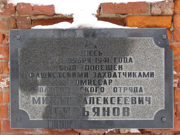 Забыл прикрепить ещё один снимок. Стена дома, перед которым был повешен комиссар. Калужская область, Угодский завод (ныне Жуков). Имя этого человека увековечено в названиях улиц многих городов, в основном крупных. Например, московская улица Гурьянова известна в связи с кровавым терактом 1999 года.