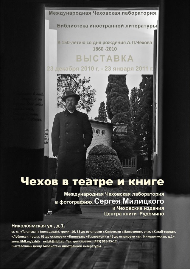 Выставка, проходившая в течении месяца в Библиотеке Иностранной литературы по 4 спектаклям Международной Чеховской лаборатории завершила свою работу. С 5 февраля она открывается в городе Королев В Деловом и Культурном центре Костино, Московская область, г. Королёв, улица Дзержинского, дом 26 (http://dkostino.ru/index.htm) и продлится в течении месяца.