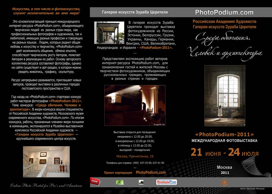 Выставка проводится по результатам фотоконкурса PhotoPodium – 2011 Открытие выставки состоится 21 июня 2011г в 18.00 Выставочный зал Российской академии художеств Москва, Пречистенка, 21