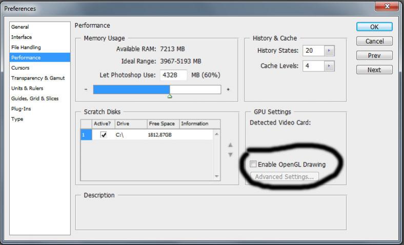 http://www.adobe.com в разделе DownLoads (предварительно зарегестрировавшись) и пользоваться 1 месяц. Обращаю внимание, что модуль Camera RAW использовался тот, что идёт изначально в CS4 (Camera RAW 5.0). Установки фотошопа использовались по умолчанию. Обратите внимание на закладку Edit-Preferences-Perfomance (см. миниатюру 1) - галочка Enable OpenGl Drawing должна быть сброшена (её установка замедляет тест примерно на 16%-17%).