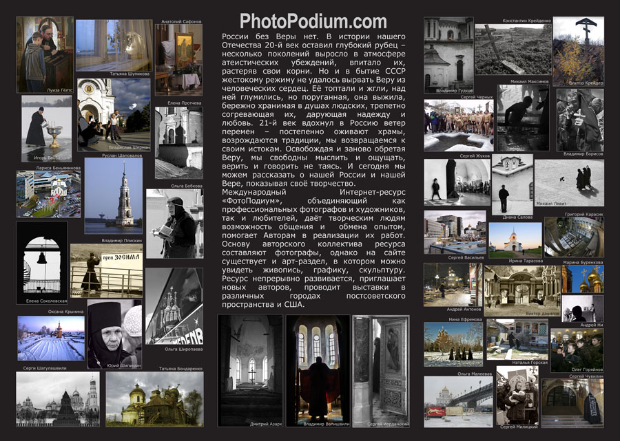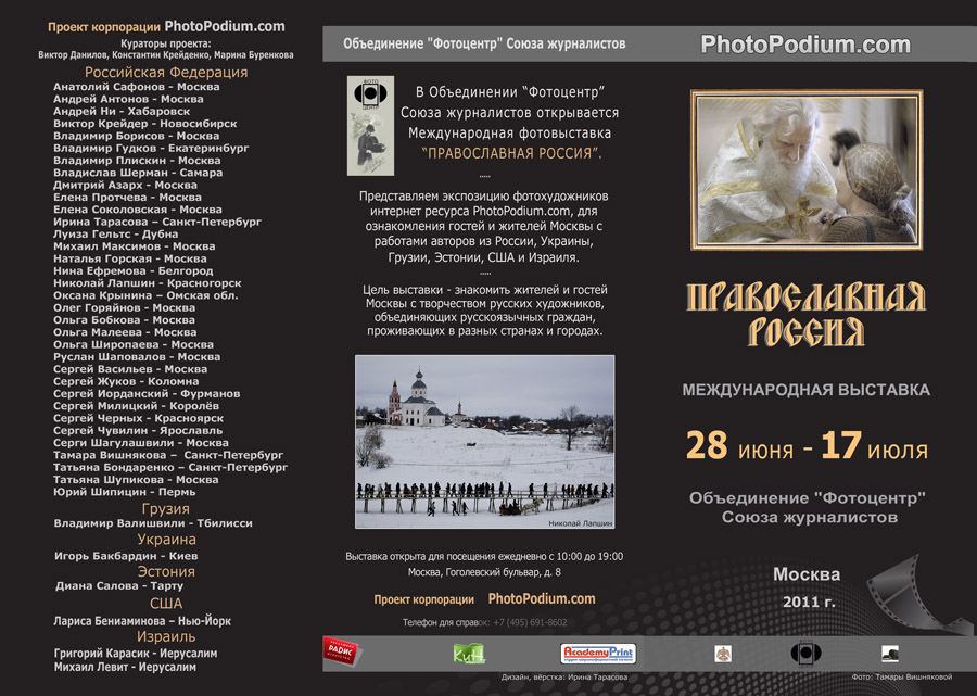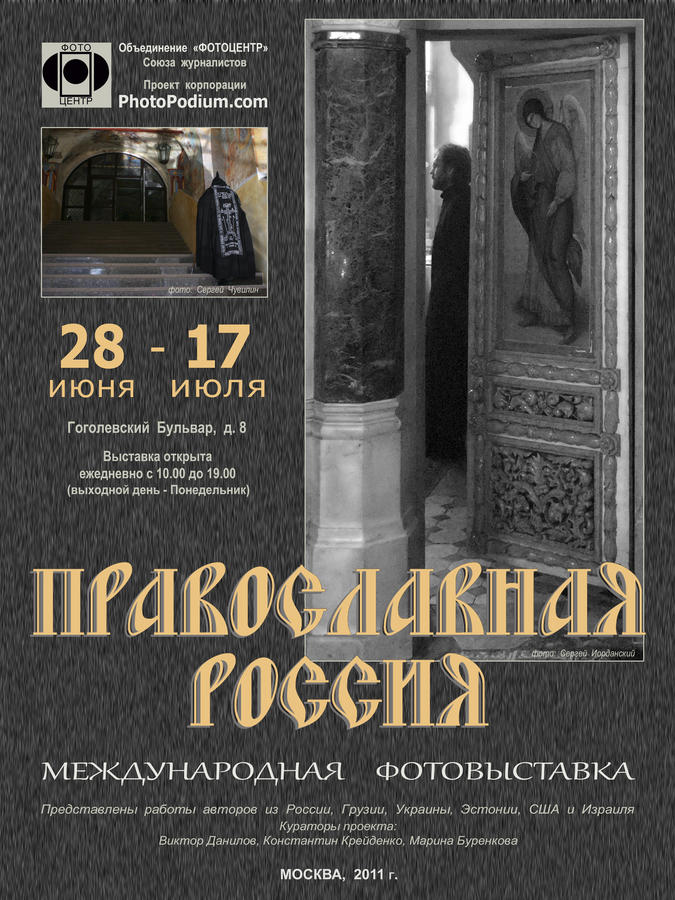 28 июня 2011 в 17.оо в ФотоЦентре Cоюза Журналистов (Москва, Гоголевский бульвар, дом 8) состоится открытие Международной Выставки авторов PhotoPodium.com *Православная Россия* http://www.foto-expo.ru/index.php?optio ... &Itemid=91 Выставка открыта с 29 июня по 17 июля 2011 года ежедневно, кроме понедельника, с 11.оо до 19.оо