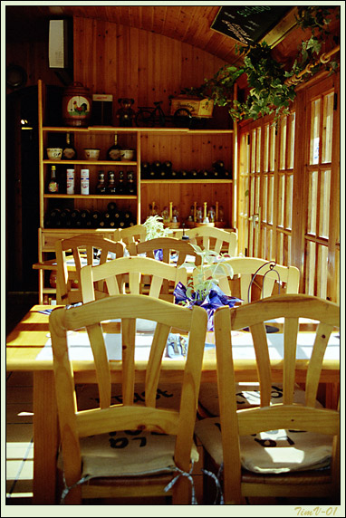 Уютно! Эти цветочки и салфеточки на столах... А подкладочки, привязанные к стульям! Очень мило.