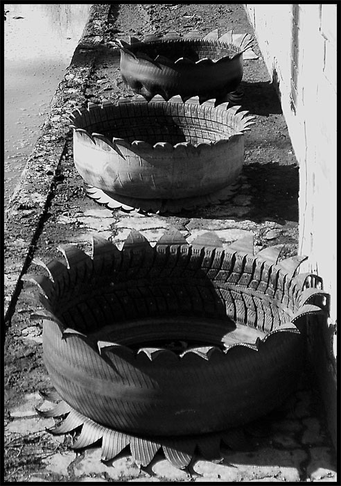 :) на самом деле я такие увидела впервые, то, что в кашпо превращают битые диски - видела, то что старые камеры - тоже, сама пользую, закапываю из кое-где в землю и сажаю в них особо агрессивные кустарники, чтобы корни не распускали:)