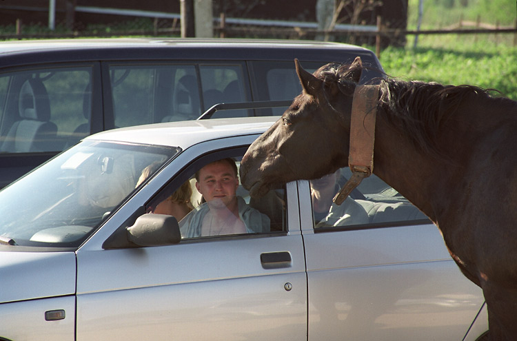 Это старая лошадь. Такая смешная попрошайка. Я бы ее угостила обязательно чем-нибудь.