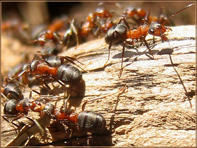Я несколько раз повторял такой эксперимент: устанавливал автоспуск, включал режим "макро" и ставил фотоаппарат в муравейник. Это один из таких кадров. К сожалению, идеальной резкости не случилось, уж очень они проворны и трудолюбивы. А сколько потом муравьев оказывалось повсюду: и на штанах, и на руках, и на самом фотоаппарате! Но ни один герой не пострадал во время съемки. Разве что некоторый переполох имел место. :)