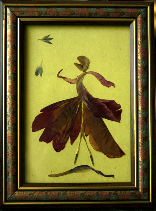 Думаю, все помнят, что у Володи была серия снимков, посвященная его умелым рукам (интарсия, макраме и т.д.) Я опрометчиво обещала тоже чего-нить показать... И так как я человек слова - выставляю один образчик флористики. Однажды я познакомилась с очень интересной женщиной (это отдельная песня!) Так вот она делала целые картины из лепестков и всякого растительного материала. А я кумушка любопытная! Вернее, любознательная. Спросила, а как она заготавливает всё это цветочное добро. "Очень просто!-засмеялась она.- Очень хорошо подходят труди классиков марксизма-ленинизма. Раньше они нам мозги сушила, а теперь я в них цветочки сушу. следуя ее мудрому совету, я заполнила всё ПСС Ленина. И стала творить!!! Это был запой какой-то! .. Короче, одну свою работу решила выставить. Выбрала специально для Володи нечто восточное, Шамархандская царица что ли? ;))))