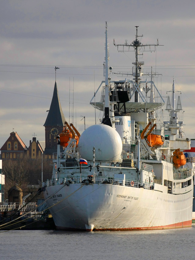 Задний план: о.Канта с кафедральным собором. Передний план: Исследовательское судно "Космонавт Пацаев"