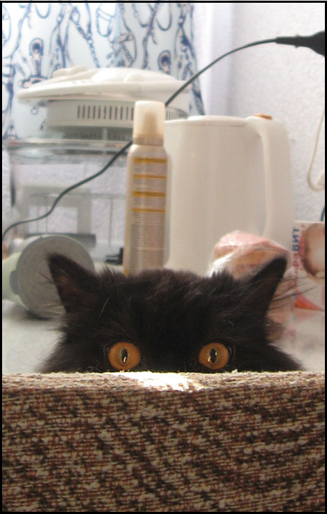 Спасибо всем, кто заглянул! Котик не боится, он играет. Подкрадывается, затаивается, а потом КАК ПРЫГНЕТ! Глаза горят азартным огнем. Ну как же - хозяйка на работу собирается, чайник включен, фен, завтрак на плите, беготня по кухне - самое время для забав! А потом будет тишина весь день, можно спать, набираться сил, чтобы снова вечером размяться за ужином и во время него.