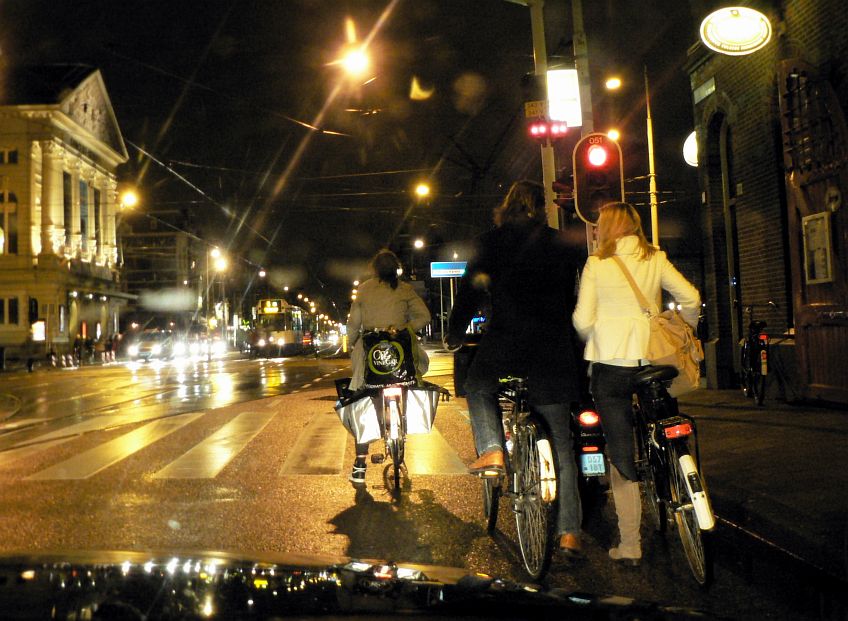 Парочка велосипедистов хороша, глаз не отвести. Будто в студии позируют: куртки черная - белая, ножки правая - левая, поворот головы - друг на друга, а над головам - лампочки красные мигают. Возникает ассоциация со сказкой: рыцарь на распутье! (Прямо пойдёшь - голову потеряешь... от любви) :)))
