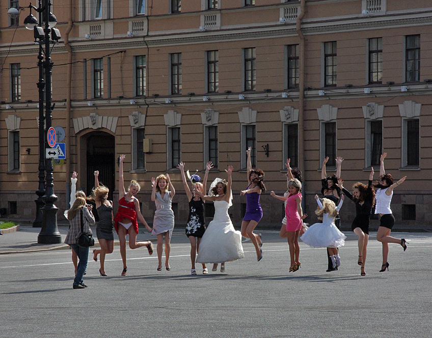 Не раз наблюдаю картинку на свадьбе: девишник веселится и радуется, мальчишник - грустит... А короткие платья во время прыжков тоже обладают своей привлекательностью ;)