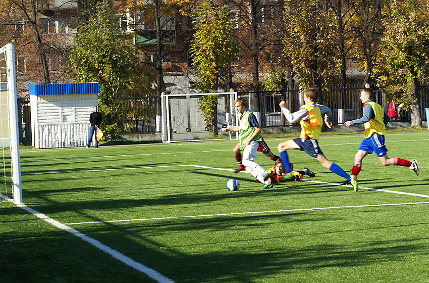 Зеленые нападают, желтые защищаются, вратарь лежит на земле
