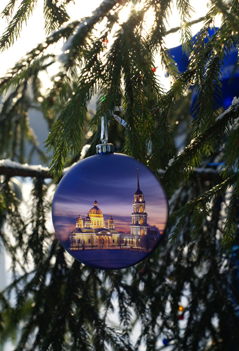 В шопе есть такой фильтр Distort->Spherize. Натягиваешь им картинку на сферу и на ёлку. Или у Макса 95-й напрокат взять и псевдофишаем сфотать. :)
