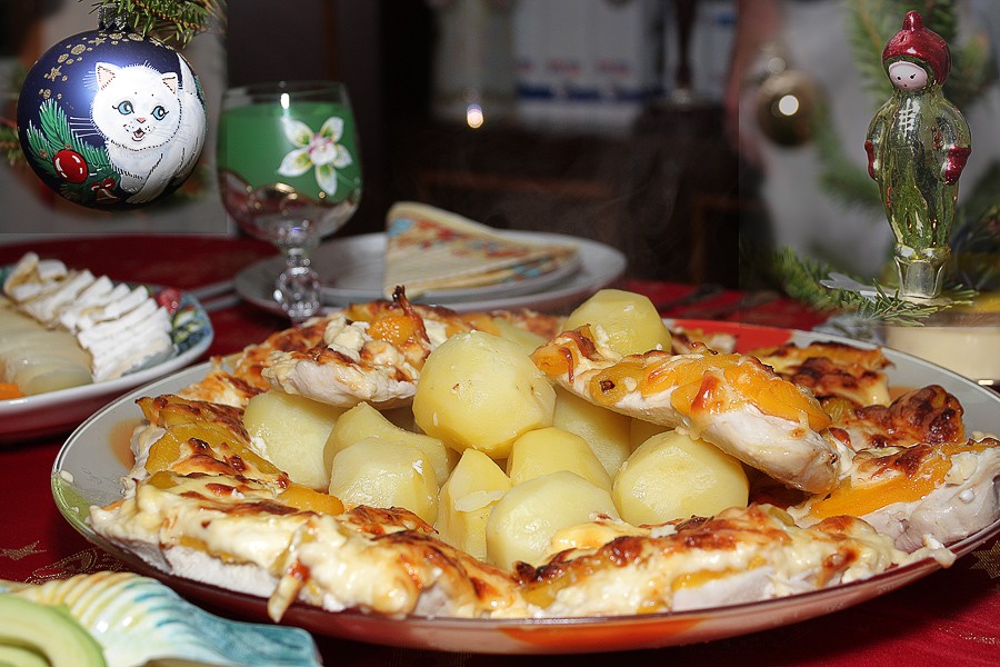 Так это блюдо называет хозяйка(они его впервые попробовали в Чехии), а по простому- куриное филе с ананасами. Куриное филе разрезается вдоль на 2 части, отбивается, солится. Потом филе выкладывается на противеь промазанный маслом. Сверху филе обмазывается майонезом. На филе выкладываются кружки консервированного ананаса и посыпается все это тертым сыром. В горячую духовку примерно на 25-30 минут