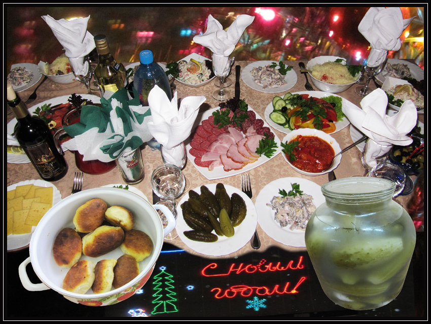 Чтобы корпоратив стал по-семейному уютным и запоминающимся, порадуйте сослуживцев домашней выпечкой и огурцами с любимой дачи. Пусть в новом году наша жизнь будет богатой, как этот уставленный яствами стол, сладкой, как эти пироги, а соль (точно по рецепту), будет в салатах и соленьях. С Новым годом, друзья!