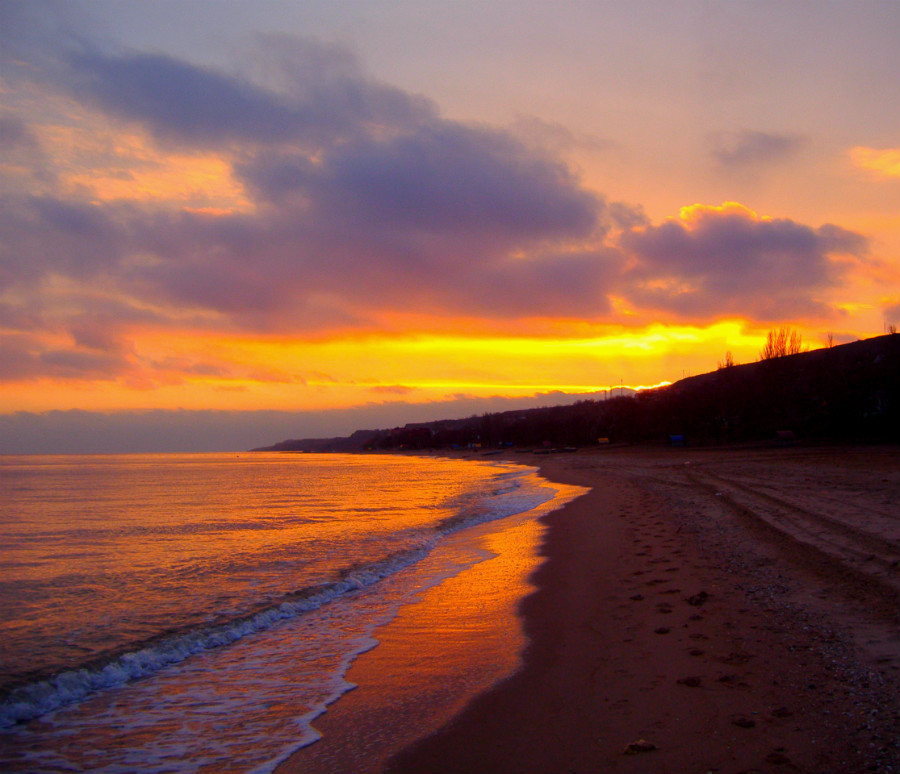 На своем ноутбуке я старалась зделать хотя-бы приблизительно так, как было. А было ярко-желтое пятно на оранжевом, розовое, сиреневое разных оттенков, и оранжевое море с сиренево-стальным отливом. Может на нормальных мониторах выглядит совсем по-другому, но закат был действительно необычный по цветам. Потому и выложила.