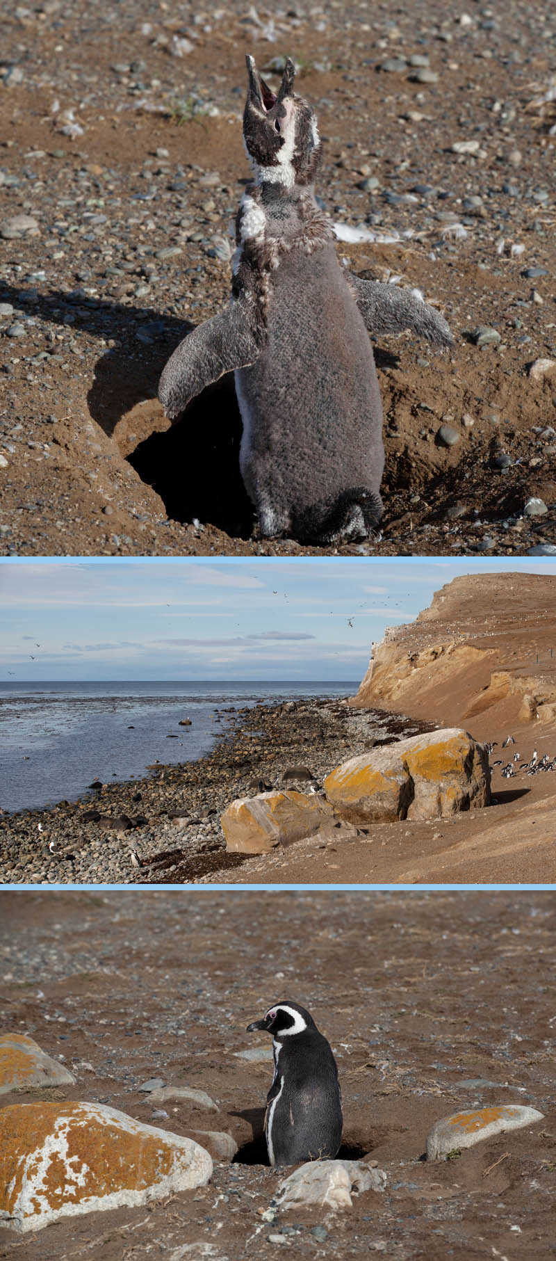 на острове Магдалены летом находится колония магелланских пингвинов - примерно 70 тыс. птиц. там они выводят потомство, а ближе к середине марта уплывают на север зимовать в более тёплых краях. эти пингвины снега не видят... оказалось, что они с удовольствием поют - это совершенно особенное зрелище :) на первом снимке птенец как раз в момент экстаза кульминации своей арии.