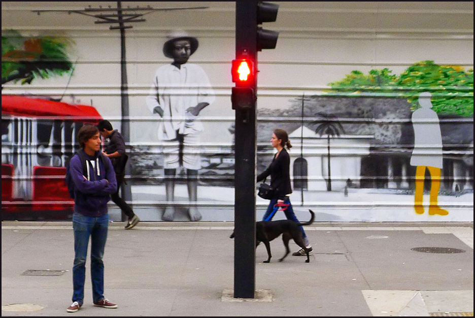 Классная сценка! Даже не знаю, что мне нравится больше - желтые ноги или красный трамвай :)