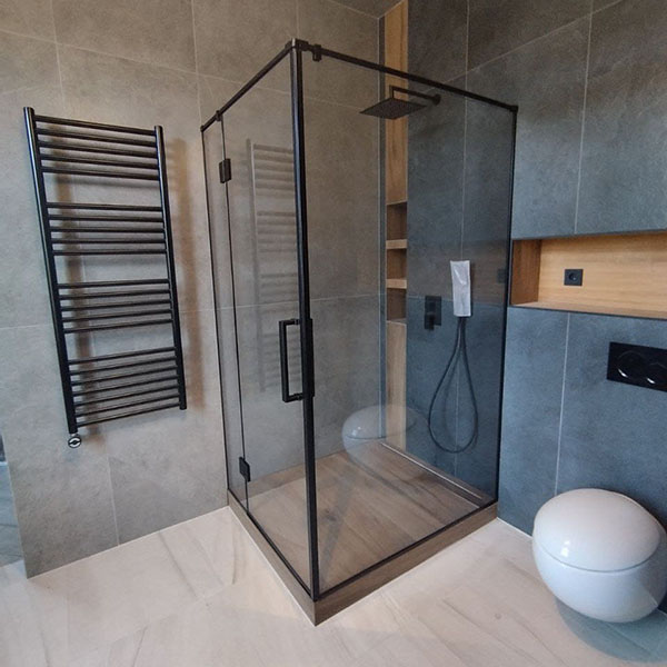 Кейс 1. Квартира в Санкт-Петербурге, 2025 год. Семья заменила старую акриловую кабину на безрамную перегородку из прозрачного стекла высотой 200 см. Комната стала визуально больше на 30%, уборка проще. Использовали профиль чёрный и фурнитуру из Германии.