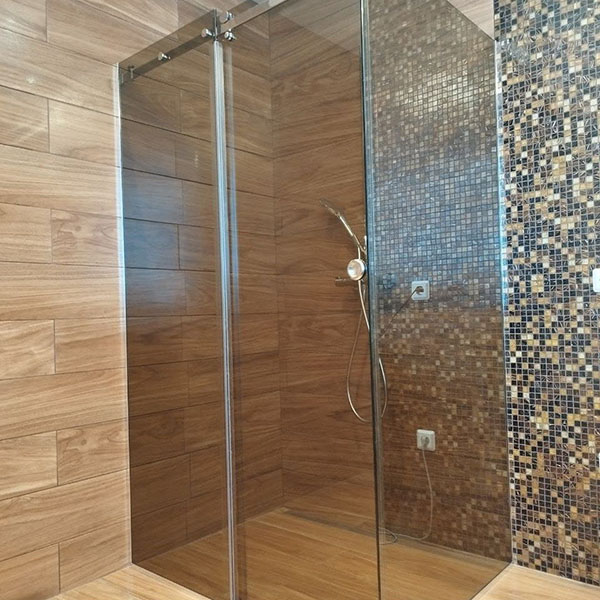 Профиль выбирают чаще всего чёрный, белый, графит или хром. В тренде безрамные системы и фурнитура из Германии и Италии. Для тех, кто любит блеск, предлагают золото и матовое покрытия. Стекло матовое особенно популярно в маленьких комнатах — оно не показывает капли воды.