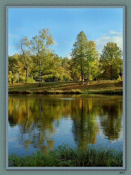 Картинка красивая, но из-за горизонта посередине, большой глубины резкости и сильно выраженной симметрии довольно плохо читается - нет главного объекта и взгляду не за что зацепиться. Я бы захватил снизу побольше, а небо немного урезал. И в резкости оставил бы только ближнме кусты и отражение.