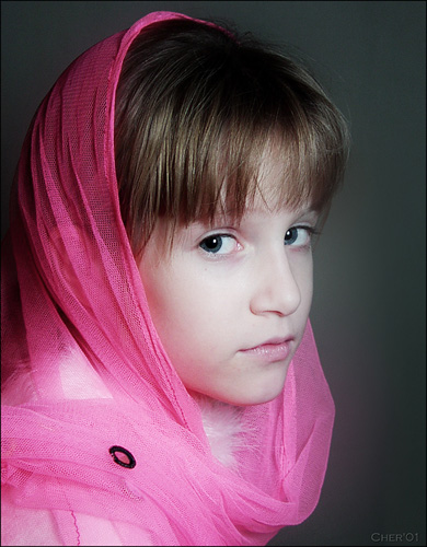 Чего-то не увидел пресловутой складки. Нормальный портретец, нежный... Искусственно-розоватый рефлекс на лице придает ему же бледности. Но, при таком расположении в кадре, я бы оставил места в низу больше. Иначе глаза по-средине прямоугольника и окружающие начинают искать складки по краям. Да и еще, в порядке придирки - сзади и сверху отбить от фона как спереди.