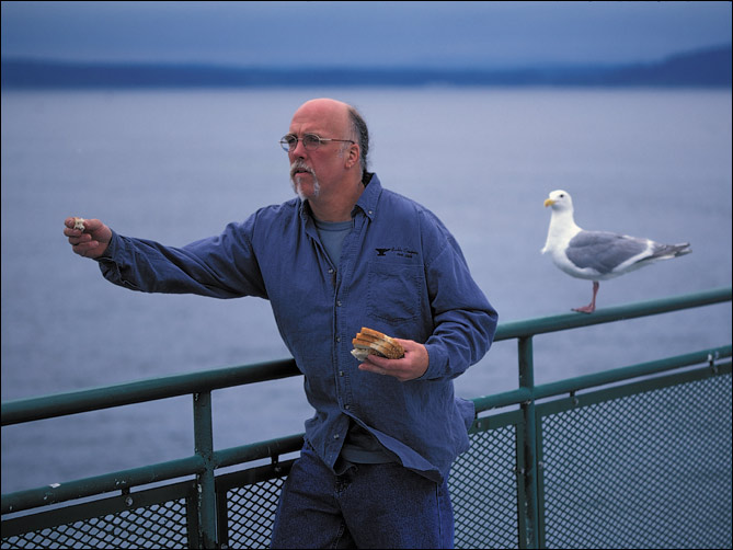 Кстати, у него на рубашке нарисована чайка и написано: "Don't feed the birds". :)