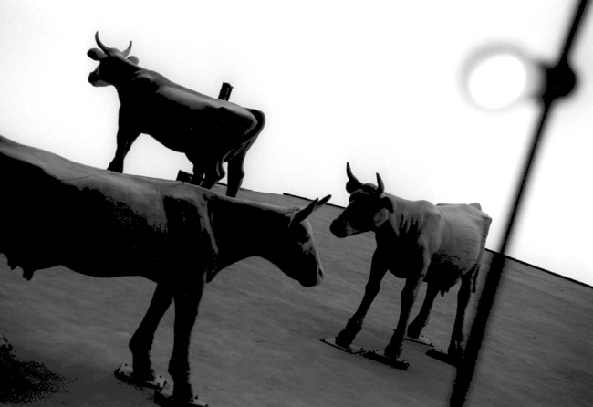 Эти коровы под лампочкой, как люди на земле под солнцем, а выше - кукловоды. Меня очень задело.