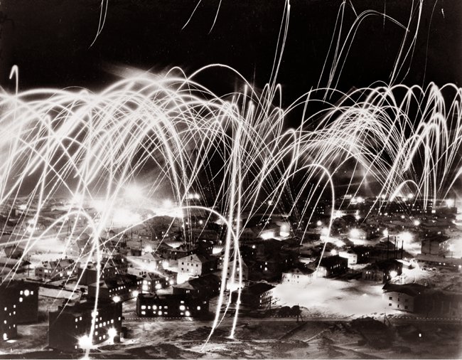 Я вижу, подготовка к празднованию Нового года идет вовсю. Внесу свою скромную лепту и я. Этот снимок был сделан 24 года назад, в момент прихода нового, 1979 года. Дело происходит в чукотском поселке Эгвекинот в заливе Креста. Там у каждого жителя была своя ракетница, и был обычай после первого тоста выбегать на улицу и палить в воздух. Тоненькая пунктирная линия в нижней части снимка – след от мигалки милицейской машины, которая медленно объезжала поселок.