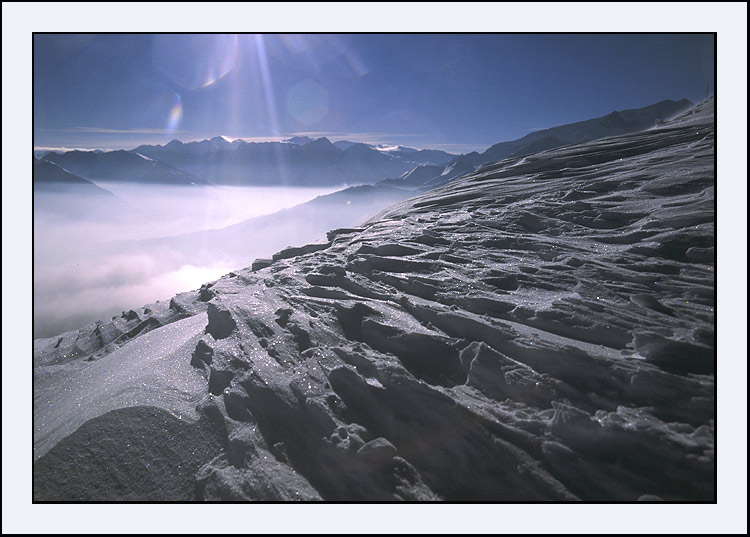 О месте и условиях. Это Альпы (Австрия), высота 2000м, ветер со снегом прямо в камеру из-за этого пришлось почти на вскидку снимать иначе залепит объектив снегом. Очень хотелось заснять поземку. Снимал с двух точек - стоя и почти лежа на снегу (это фото), коррекция 2, поляризационный фильтр. Там где стоя видна поземка и блик более аккуратный, но не так интересен ракурс, а здесь интереснее, но не видно поземки. Ну а блики... это кому как:-))