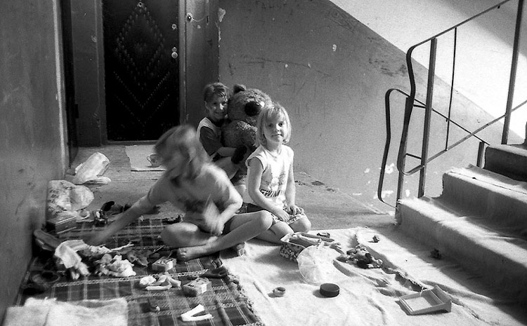 Вообще это не фотография о несчастном детстве. Повторюсь - отъедьте на 30 км, в Первомайск, например - там все куда более трудно. В этом поселке у людей (в массе) есть работа и зарплата за нее. Здесь нет никакой чернухи. Так живут. На лестнице просто прохладнее..
