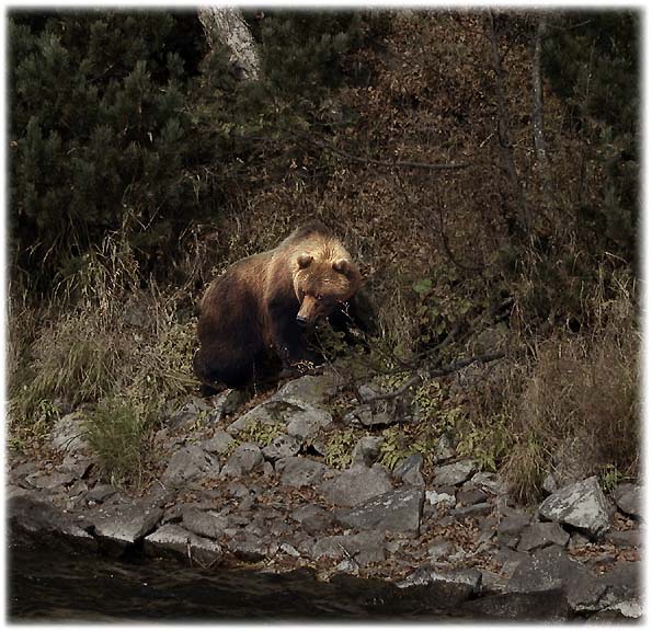 Миша объелся нерестующими лососями и никак не хотел уходить с реки. Я раздражал его на лодке с мотором. Несколько раз медведь рявкал, показывал, что сейчас прыгнет в воду, к моему корыту, но... уходить не желал. На принцип пошел. Видно, лень ему было с набитым брюхом суетиться. Через пять минут моего щелканья затвором он понял, что я тоже не уйду. Тогда Миша нашел идеальный способ продемонстрировать свое превосходство. Он просто написал на мое внимание. А потом улегся в кедраче и забыл про меня.