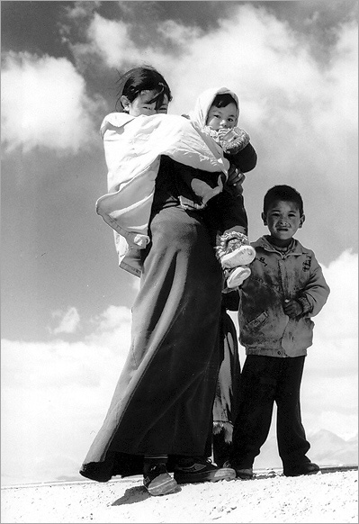 (3)Ян: почти лечь на асфальт пришлось. Тибетцы феноменально любопытны и отличаются своей полной непосредственностью. Не верьте в пустынность Тибета: где бы вы ни остановились на ночлег (а это везде высота около 4500 м), только поставили палатки и занялись своими делами, обязательно к вам тут же начнут стекаться тибетцы со всех окрестных сел и несколько часов будут вас разглядывать. Откуда они взялись, из под камня что ли вышли, эти тибетские пастухи. С обязательной косой, обернутой вокруг головы, с вплетенными в косу костяными и каменными украшениями, прядями красных нитей и т.п. Через пятнадцать минут – подойдут еще пять тибетцев, еще через полчаса на повозках, запряженных пони, подъедет целый табор.