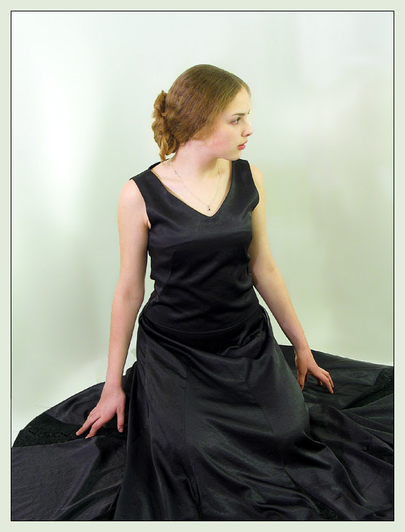 Совет второй: если модель смотрит не в камеру, а за пределы кадра, не стоит её располагать по центру, то есть надо избегать центральной композиции при съёмке, потому что в каких-то случаях хорошо откадрировать потом сложно. В данной картинке логичнее было бы оставить меньше места слева и дать больше подола платья.