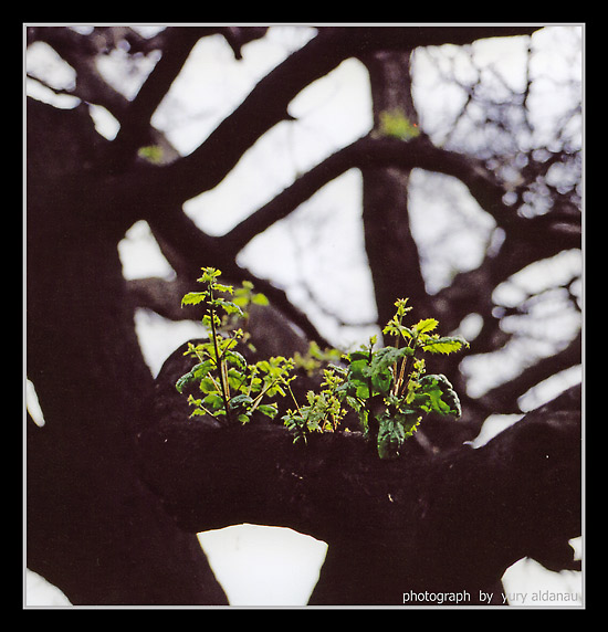 Листочки хорошо смотрятся. Но как-то очень отвлекает белое пятно, напоминающее перевернутую трапецию, под ними. Оно не воспринимается как прогал между ветвями.