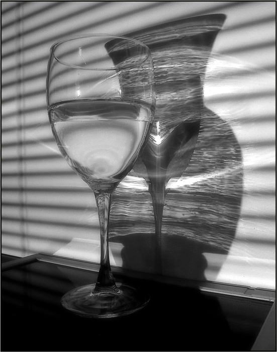 \2\Victor Oknyansky:\4\Громов Василий: Как получилась горизонтальная линия в бокале могу только догадываться. Я думаю, это вид снизу на дальнюю сторону поверхности воды на границе с бокалом. Он выглядит плоским (прямым) из за такого угла зрения. И загибается в верх на стеки бокала (как и должен), но очень круто. Тень жалюзи и кувшина, преломленные в воде и стекле бокала маскируют изгиб пограничного слоя вверх. Это моё предположение. А снималось это просто. Закатное солнце за окном с жалюзи - сзади и слева от меня. Стеклянный кувшин с водой на дне, на линии "солнце-бокал-стена" левее меня и вне поля зрения камеры. Бокал стоит на поляризационном экране для монитора. Съёмка проводилась в кабинете начальника (после его ухода с работы)- закатное солнце в его кабинете даёт потрясающее освещение. :).Спасибо