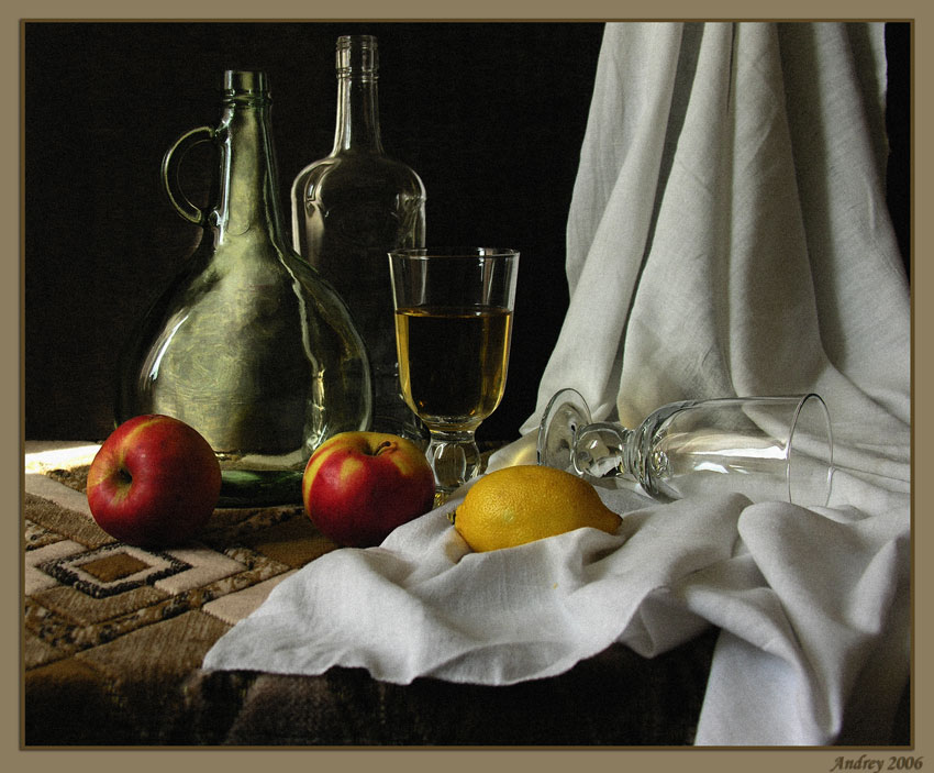 Яблоки лимон, фужеры на одной линии не очень хорошо и ковровая дорожка по-моему не в тему, бутылки классные.