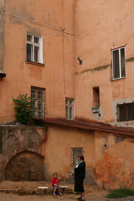 1/ ну как не присходит? кукольная девочка в красной кофте держит куклу на руках и смотрит на вас. Тётка, очертаниями и цветами напоминающая одно из окон, стоит рядом с ней.