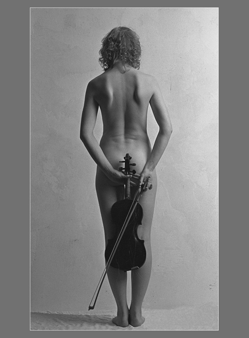 Может быть, я не совсем понял идею? В моём понимании получается так: голая перед голой стеной. Скрипка, перечёркнутая смычком, смотрится стыдливым прикрытием, по сути исполняющим партию фигового листка.
