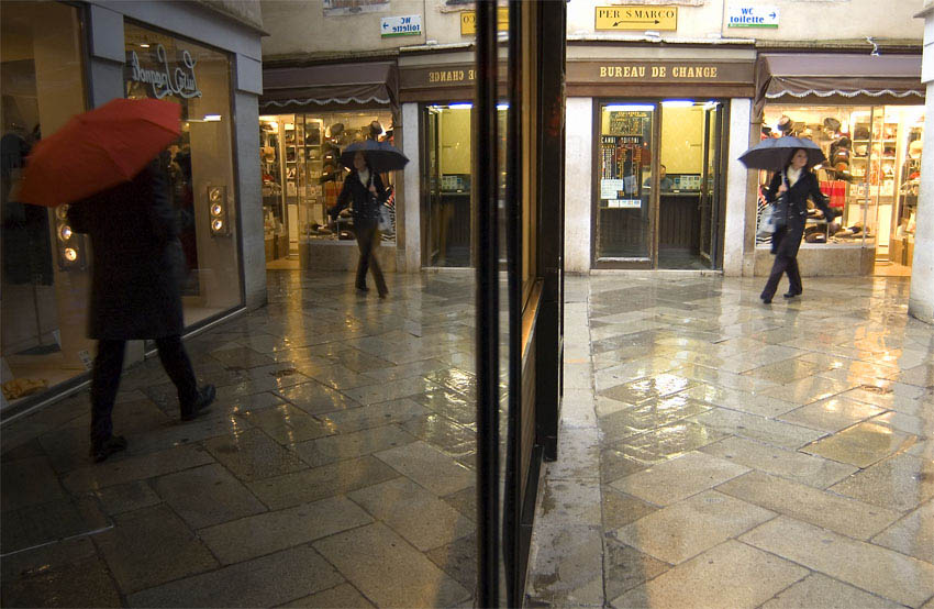 1 - Миша, какое такое дело не пришло тебе в голову? Снимать отражение в витрине вместе с реальным объектом - прием более чем затасканный. Этот кадр не очень скучный, хоть и некрасиво построен, красный зонтик и живая девушка его оживляют, но снимок очень уж грубо поделен пополам. Наверное, нужно было снимать левее, но делящая кадр рама от витрины все равно очень грубо смотрелась бы.