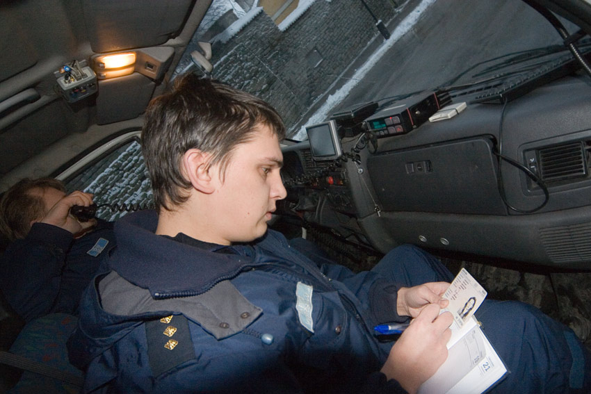 Вот этот человек в форме полицейского, на которой была написана фамилия Taivo Veersalu, выписывает данные из документов задержанных.