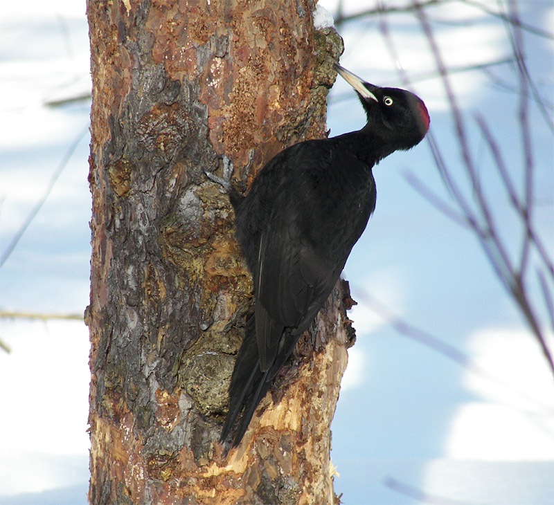 Да, сам был удивлен, когда птица приземлилась в метрах пяти от меня и дала спокойно поснимать. В это время у меня был дежурный 12-кратный объектив. Кстати, прочитал про черного дятла, что он имеет привычку сопровождать в лесу человека, близко садиться от него и с любопытством выглядывать из-за дерева. Примерно все так и произошло, из-за дерева он тоже выглядывал, есть соотвествующая фотография