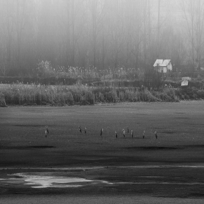 Вероятно, птицы - это цапли. Их вертикаль сочетается с продолговатыми деревьями.