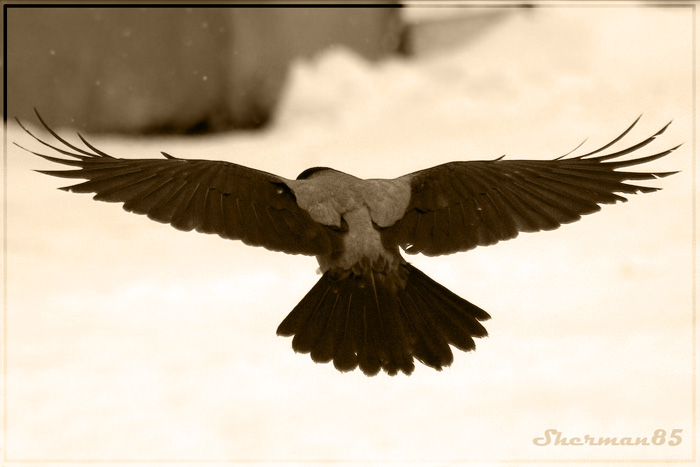 За этой вороной я наблюдал около 20 минут, и снимал с расстояния примерно метро 50 в снег, при этом очень сильно был ограничен в движении (снимал из окна).