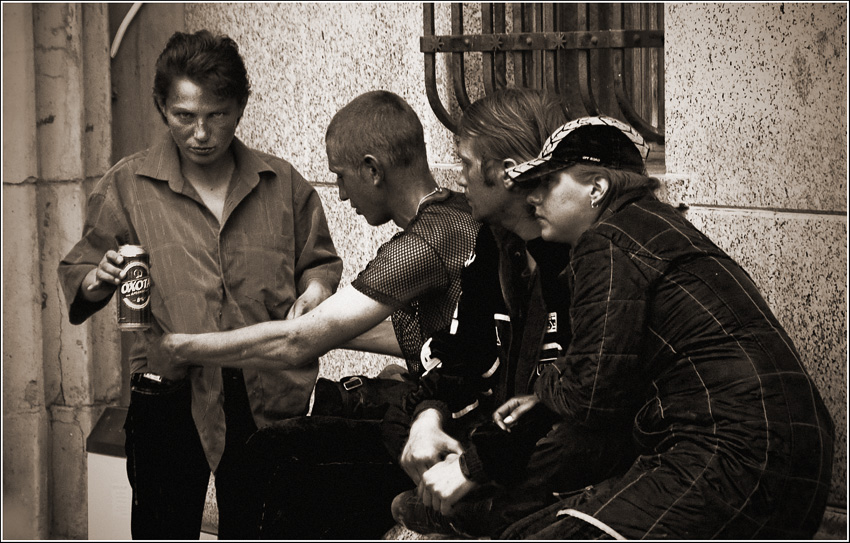 Дикий взгляд, худая исколотая рука, рельефный профиль,все взгляды на банку, задворки...потрясающе четкий, убийственный снимок-трагедия. Рек!