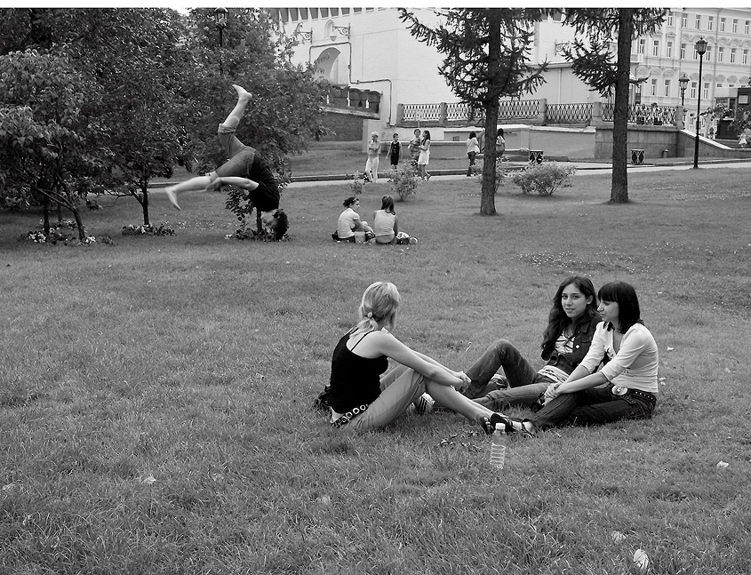 во как старается перед девочками. А все равно не все внимания обратили, одна на автора заглядывается)) Хорошая работа, понравилось качество снимка и жанр