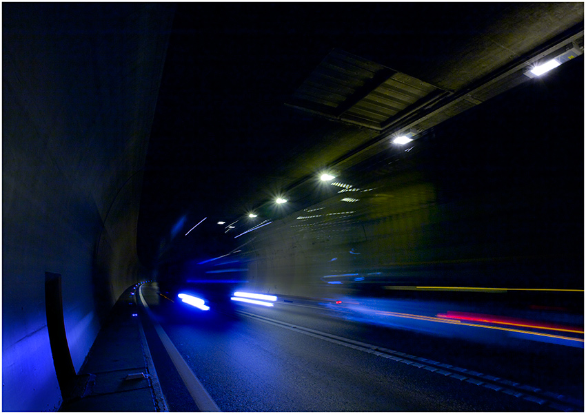 Снято в туннеле Роппен в Австрии, где я нагло остановился в кармане, поставил штатив и начал снимать. Не сразу подобрал нужную выдержку. В туннеле было трудновато дышать, а поток воздуха от фур иногда буквально сдувал меня вместе со штативом. Кончилось это все полицейским участком в Имсте, куда я был препровожден блюстителями порядка. Вспомнив весь свой школьный немецкий, в институте я английский изучал, я все же сумел убедить австрийских гаишников, что я не шпион и не террорист, что я просто приехал из России на ЕВРО-2008 поболеть за наших футболистов, а еще я люблю фотографировать все, что шевелится и не шевелится. Ключевым моментом был показ мною отснятых кадров на экране фотокамеры. Полицеские наконец заулыбались и отпустили меня с Богом. ISO400, f11, 1/5 sec.