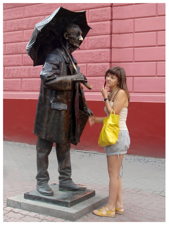 Красноярск. Путник под зонтом на проспекте Мира. Если потереть ему нос, исполнится желание. Это мне объяснила девушка - та, что в кадре. Она долго стояла перед стариком, консультировалась по телефону, а потом с воодушевлением совершила магический обряд. Я потом тоже попробовала. И знаете? Всё точно!