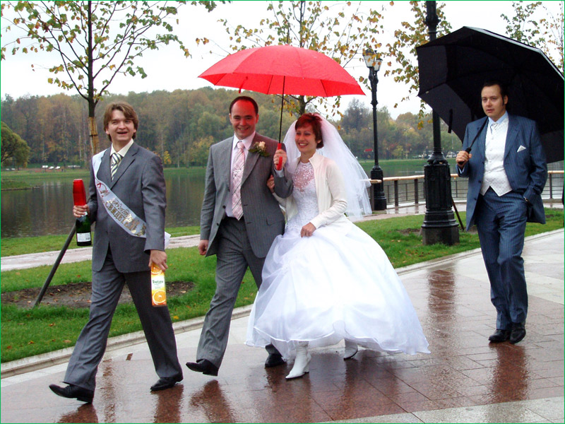 /1/ Здравствуйте, Александр! Спасибо за отзыв! На оригинале этой фотографии в кадре было 6 фигур: трое весельчаков слева и серьёзная троица справа, включая брюнетку в белом пальто со свадебным букетом в руке. Импозантного мужчину с огромным чёрным зонтом я оставила для цветового контраста зонтов и обрамления пары, а "лишних свидетелей" убрала. Ваш вариант меня заинтересовал. Попробовала так сделать - и хохотала от удовольствия полчаса! Снимок приобрёл абсолютно новое содержание и настроение! Подработаю и выставлю под названием "Третий - не лишний". Годится в раздел "Юмор"?
